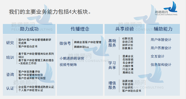 提供客户体验测评、客户体验优化与设计、客户体验管理体系搭建及管理人才培养等咨询及培训辅导服务